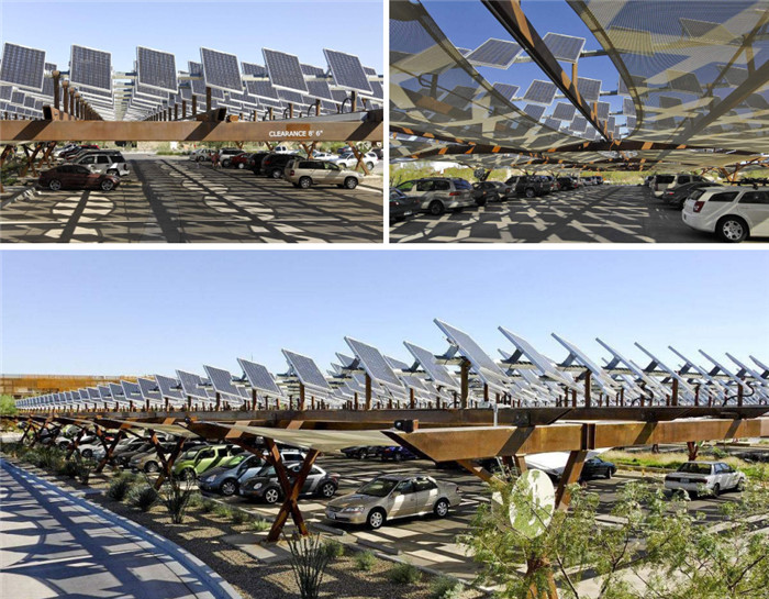 根據(jù)溫泉項目設(shè)計的地形地貌進行停車場的規(guī)劃設(shè)計,打造一個既獨具大漠風(fēng)格的特色風(fēng)貌停車場,采用節(jié)能環(huán)保的材料,上層可放置太陽板既進行綠色能源的使用,也可以為下層的停車車位提供遮陰物體,一舉多得。
