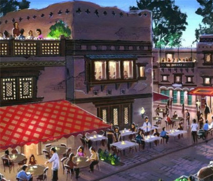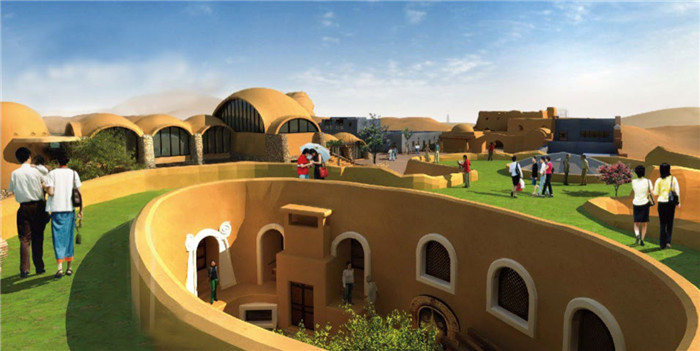 貼合當代推進“一帶一路”經濟發展帶的利國利民的政策背景,將文化體驗商業區分為文化體驗街、日月星辰文化廣場兩部分,兼備文化展示、形象廣場和人流集散等功能。整個文化體驗商業額區充分提取絲綢之路相關文化,挖掘絲綢之路的文化價值,融入當地特有的關城文化、長城文化、戈壁大漠文化并形象具體化加以體現,與項目地其他功能區形成“度假 + 商業 + 文化+ 養生 + 娛樂”的完整產業鏈,打造一條可以同時滿足游客購物與特色文化體驗需求的特色文化體驗商街。該區域的溫泉設計不僅可作為一個當地特色文化包裝打造的場所,是一個情景式的情感體驗之地;也可以舒緩人流,更大限度為游客提供舒適的游玩休閑空間。