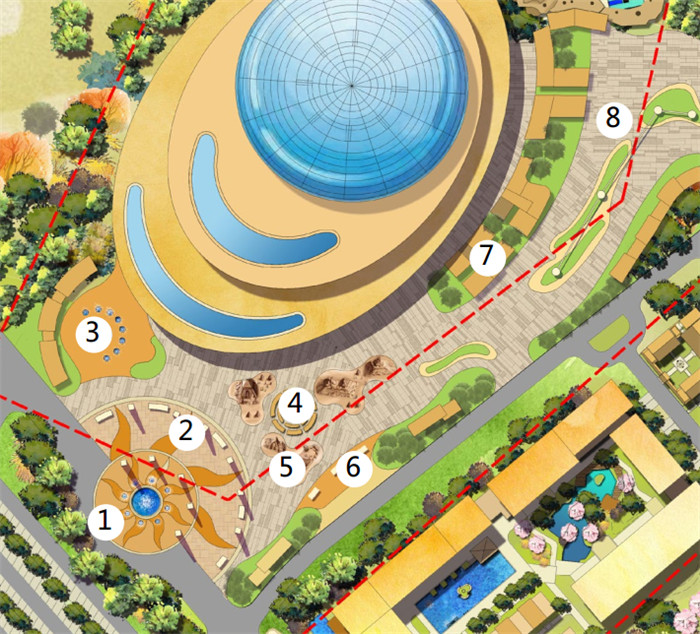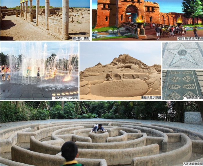 1 日月星辰文化廣場 2 星月柱3 兒童戲水廣場 4 古跡迷城5 主題沙雕 6 廣場景標7 文化體驗街 8 特色文化鋪裝